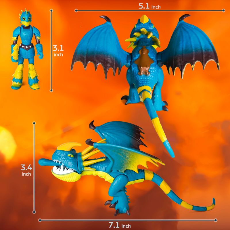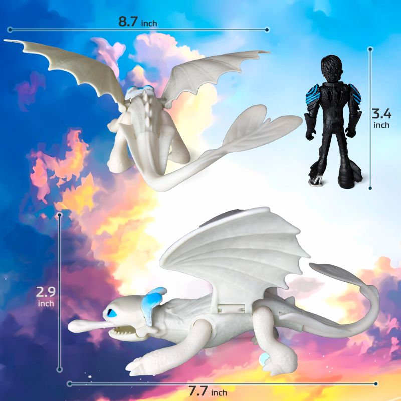 This version of the collection includes the legends of the famous fantasy saga: Light Fury, Night Fury, Deadly Nadder, Astrid Hofferson and two figurines of Hiccup. Viking heroes have additional tiny weapons: Hiccup wields a sword, Astrid wields an axe. 3 cute beasts will help you make an exciting flight into the cloud. Each battle dragon toy is a detailed beast with orgomic wings and a powerful tail. These are titans among animals. And they will help create amazing adventures in your babies imagination. Turn on your imagination and, like dragon riders, fly at dusk to the stars and hide in the clouds!